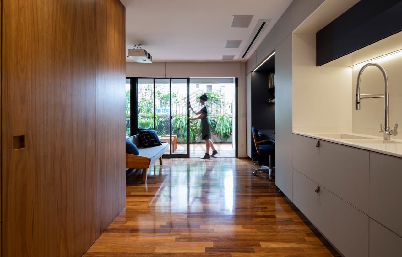 Piso de cumaru dentro e fora do apartamento, marcenaria super inteligente e de alta qualidade, com muito espaço para guardar tudo que precisar, closet amplo com 6 portas e iluminação de led, equalizador, projetor HD e tela retrátil com alto falantes no teto para aquela maratona de filmes com qualidade de cinema, pias de quartzo branco, lava e seca para não depender da lavanderia do prédio, banheiro com exaustão dentro do box e vidro piso teto para não embaçar espelho e paredes, cooktop top, forno e micro ondas Brastemp Gourmand, coifa, espaço para home office de verdade, quintalzinho com jaboticabeira e muitos pássaros, cortinas blackout, sol da manhã, silêncio, conforto e segurança em um prédio com estrutura de clube a poucos passos da estação Campo Belo, com academia, piscina aquecida, sauna, sala de pilates, espaço gourmet, churrasqueira, solarium, mercearia, bikes de uso coletivo, salão de festas e home-office com salas de reunião.